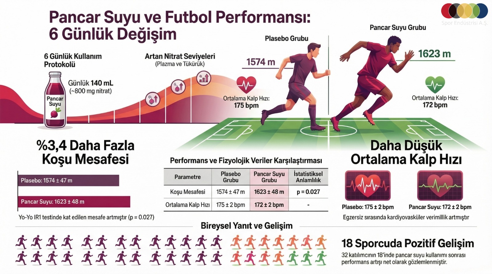 Altı gün süren pancar suyu tüketimi, plasebo miktarına kıyasla plazma ve tükürükteki nitrat ve nitrit değişimlerini anlamlı şekilde artırmıştır (p < 0,001). Ayrıca Yo-Yo IR1 testinde kat edilen mesafede %3,4 ± 1,3 oranında artış gözlenmiştir (1574 ± 47 m’den 1623 ± 48 m’ye; p = 0,027). Bununla birlikte ortalama kalp atım hızının pancar suyu sisteminde (172 ± 2 atım/dk), plasebo kaydına (175 ± 2 atım/dk) göre daha düşük olduğu belirlendi (p = 0,014).